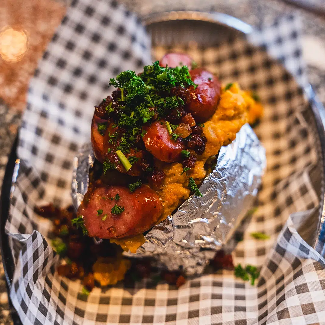 Dogtails tilbyr pinnekjøttpølse og reinsdyrpølse med bakt potet og lokale sauser fra Vestlands Chilli.