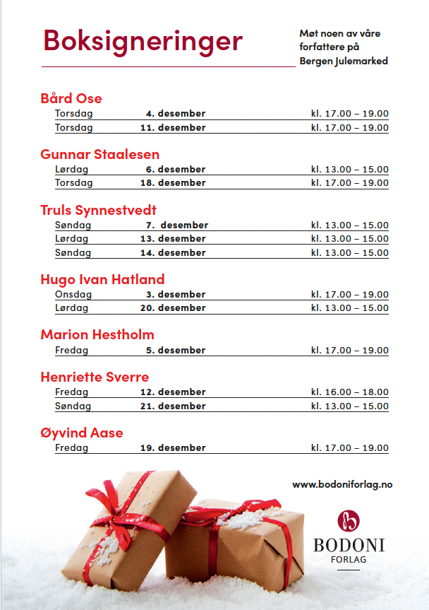I boden til Bodoni Forlag finner du et rikt utvalg av flotte bøker – spesielt for deg som er glad i historie, kultur og lokal litteratur. Her kan du få kjøpt årets nyheter, og dessuten et bredt utvalg av tidligere utgivelser til svært gode julepriser. Se mer i vår katalog. Du kan også møte våre forfattere på boksigneringer hver helg gjennom hele desember. Se oversikt lenger oppe på siden.